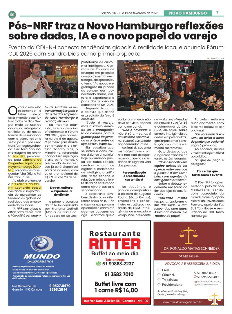 12 Fev Pós-NRF traz a Novo Hamburgo reflexões sobre dados, IA e o novo papel do varejo é destaque na imprensa local