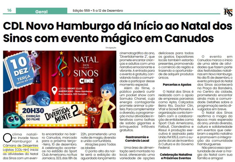 06 Dez CDL-NH dá início às atividades do Natal dos Sinos com evento mágico no bairro Canudos é destaque na imprensa local