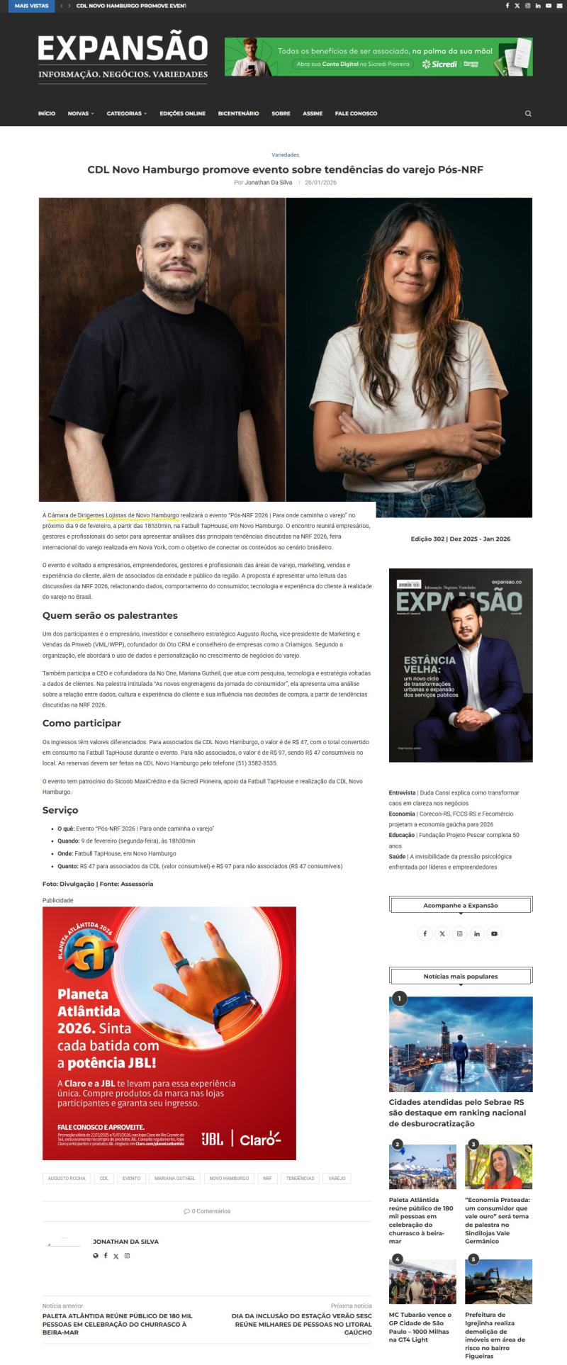 26 Jan CDL Novo Hamburgo promove evento Pós-NRF 2026 sobre os rumos do varejo é destaque na imprensa local