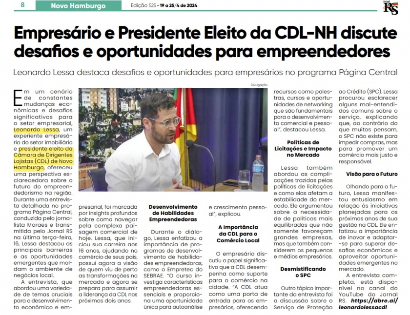 19 Empresário e presidente eleito da CDL-NH discute desafios e oportunidades para empreendedores é destaque na imprensa local