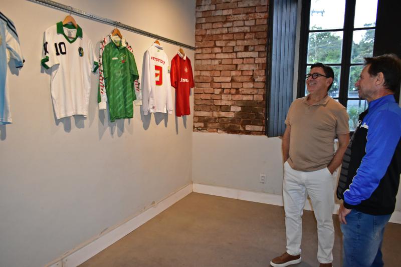 Ronaldo Brum, com camisetas de futebol do mundo; Adriano Nunes, com facas;
