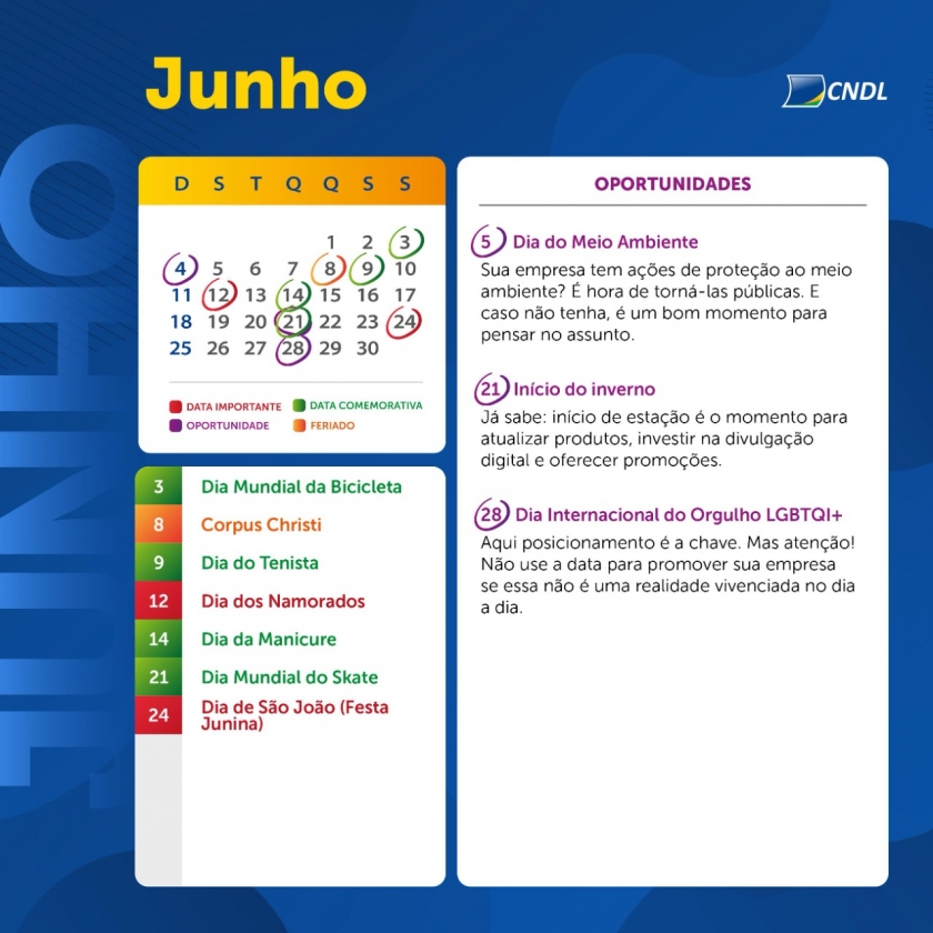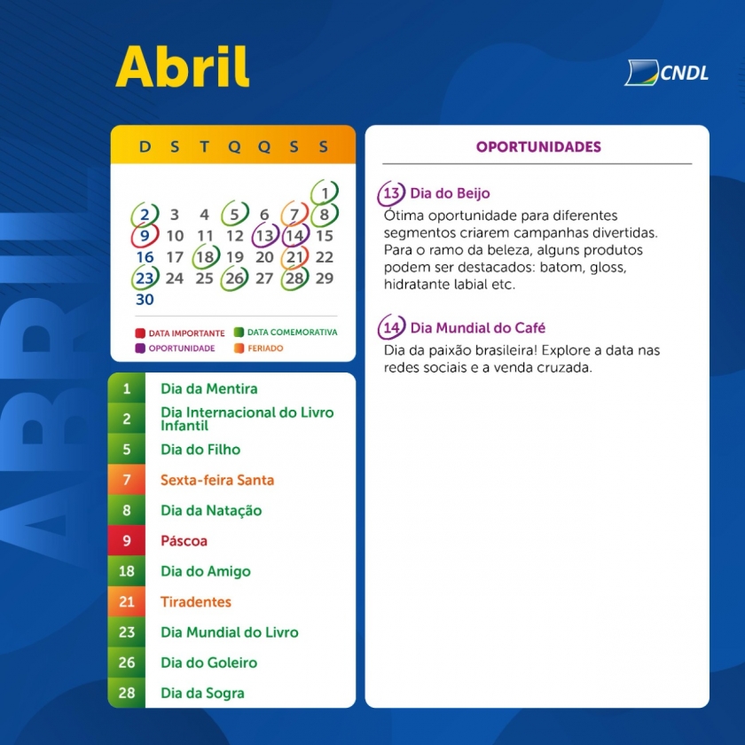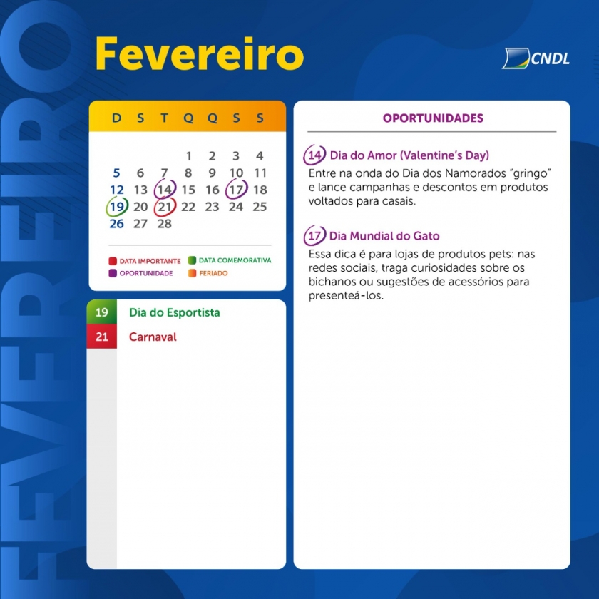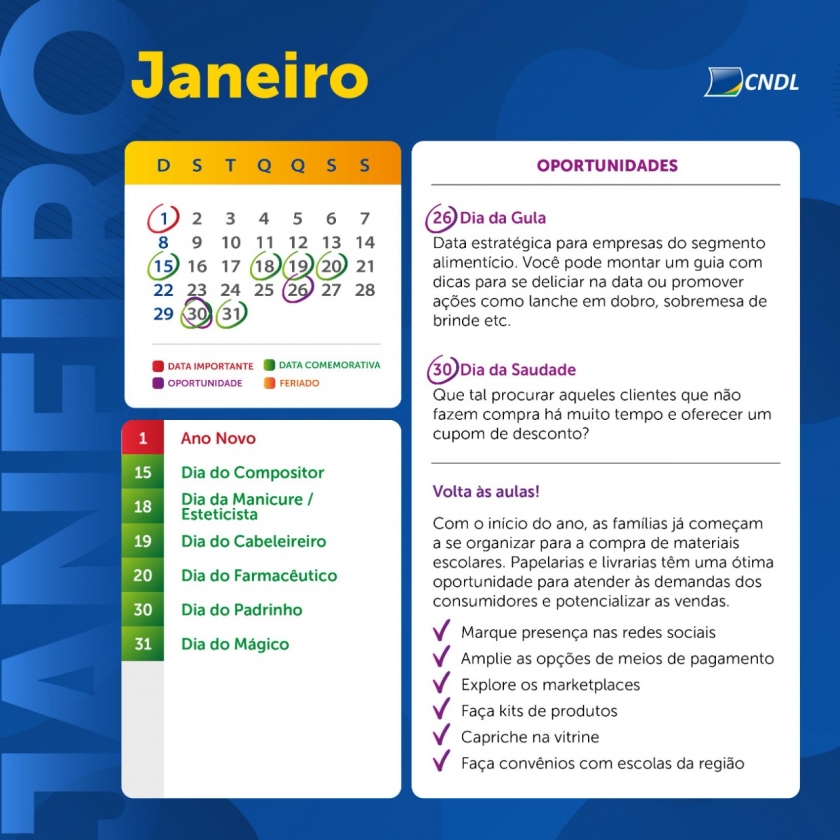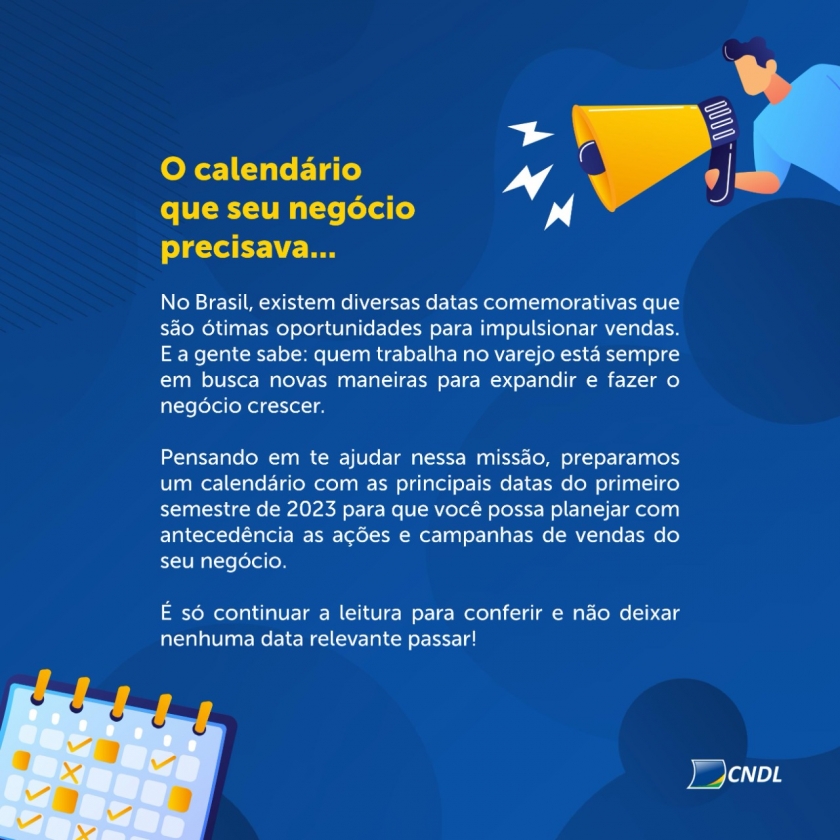 23 Jan Que tal conhecer as principais datas comemorativas para impulsionar suas vendas? Confira o primeiro semestre do calendário.